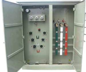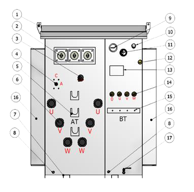 Interruptor, seccionador bajo cargo de dos a cuatro posiciones este accesorio se encuentra dentro de la cuba, maniobrarla sólo con pértiga de gancho retractil. Aislador de tipo pozo corto (bushing well), adosado en el lado frontal del transformador, tiene un alojamiento en el que se inserta el conector interfase bushing Insert para luego conectarse a este el terminal tipo codo premoldeado. Conector interfase – Bushing Insert, estos conectores sirven de interfase para relacionar la conexión entre el aislador tipo pozo con el conector tipo codo premoldeado. Conector tipo codo bajo carga., el conector tipo codo permite acoplar el cable de acometida de media tensión con el aislador conector interfase Bushing Insert.